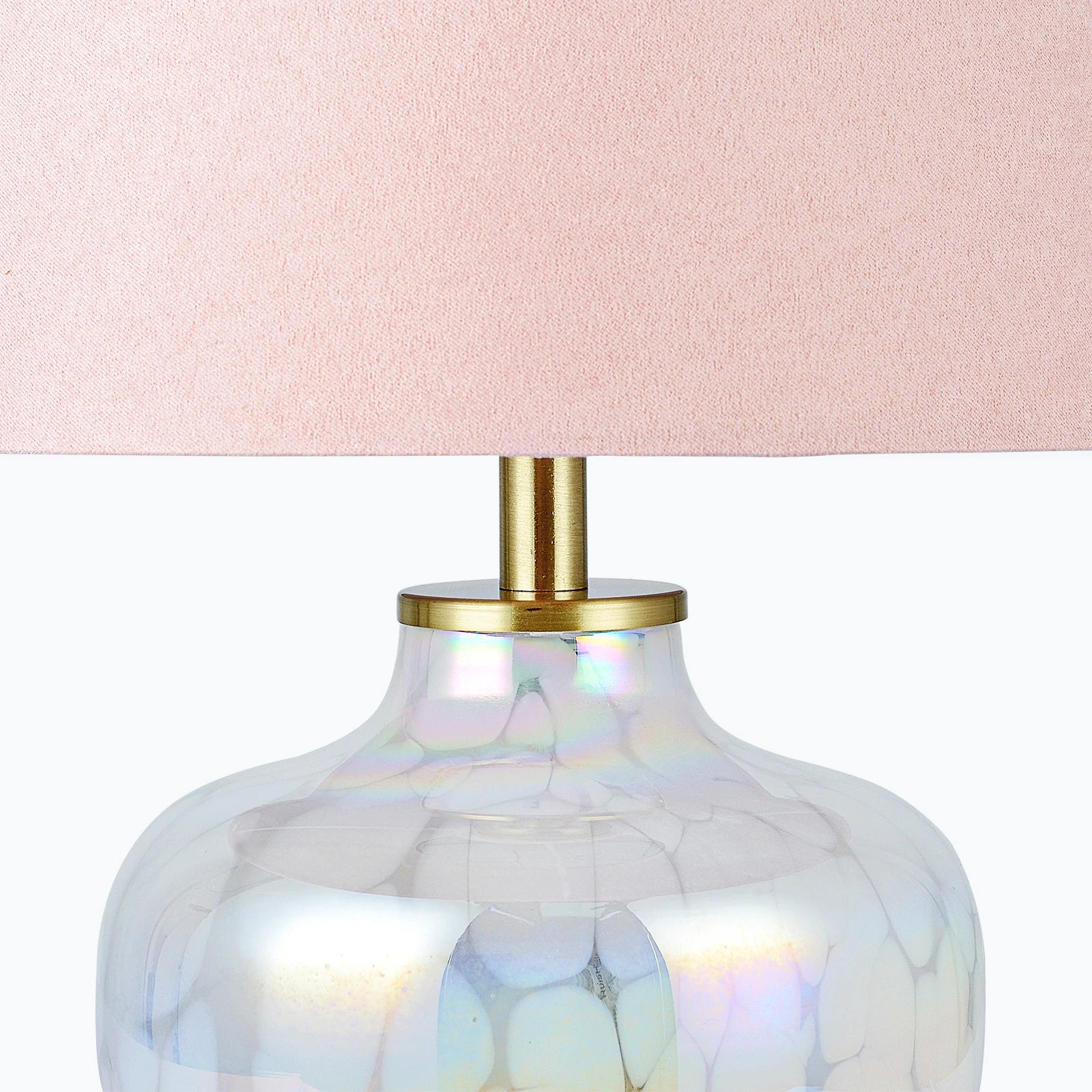 The beautifully designed glass base features a mesmerizing pearlized swirling cloud pattern, creating a dreamy glow that fills your space with iridescent colors and supercool style. Finished with a soft velvet blush pink shade and elegant gold metal details, this lamp adds a gentle feminine touch and contemporary flair.