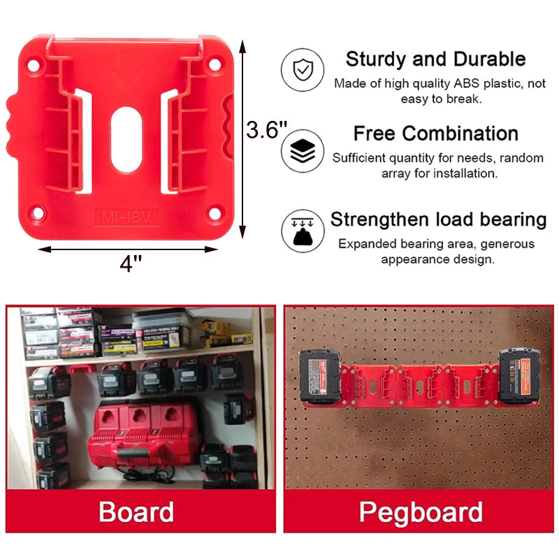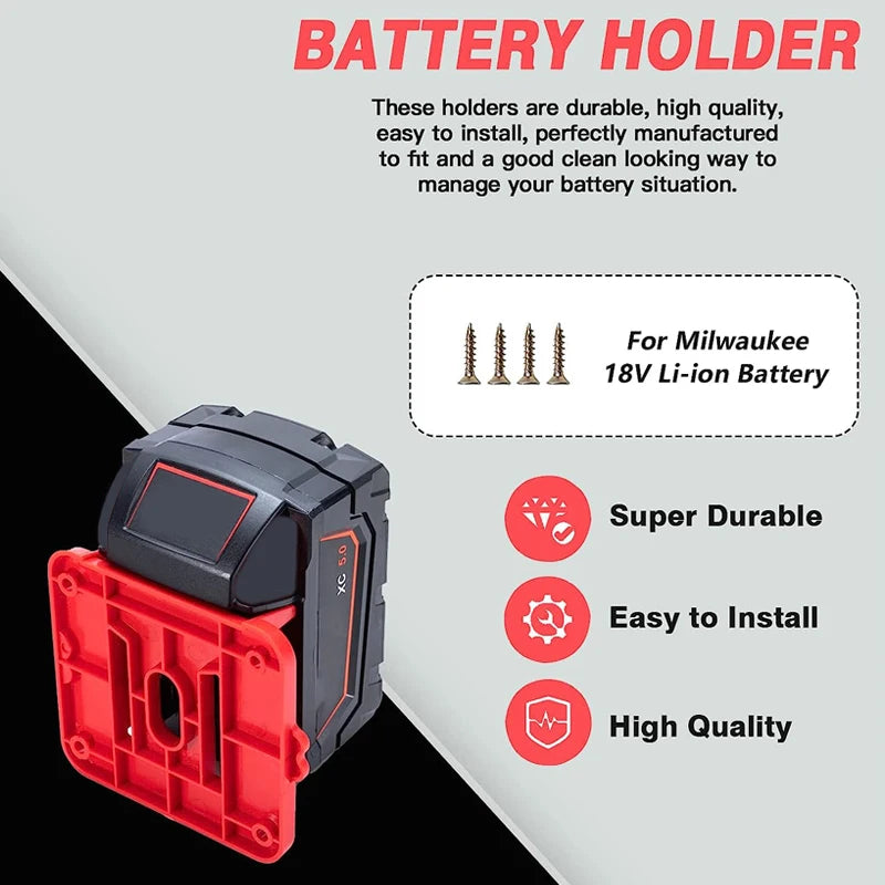 * The Battery holder perfect fit for Milwaukee 18V Battery and very easy to use. They work well for hanging your batteries in an organized way on a wall or under a shelf.