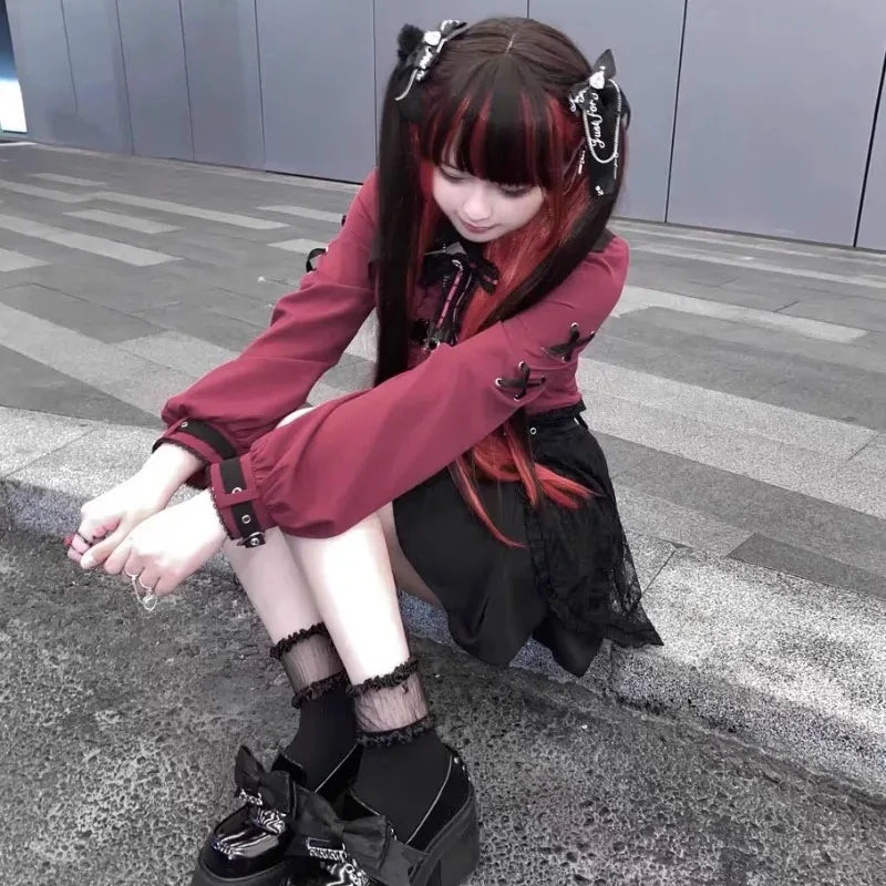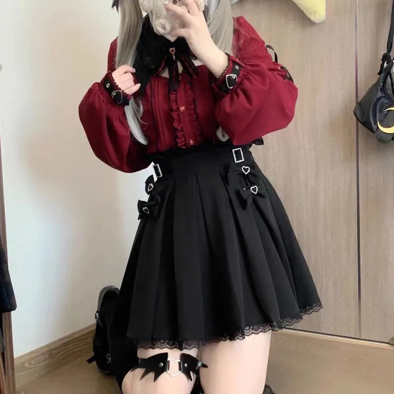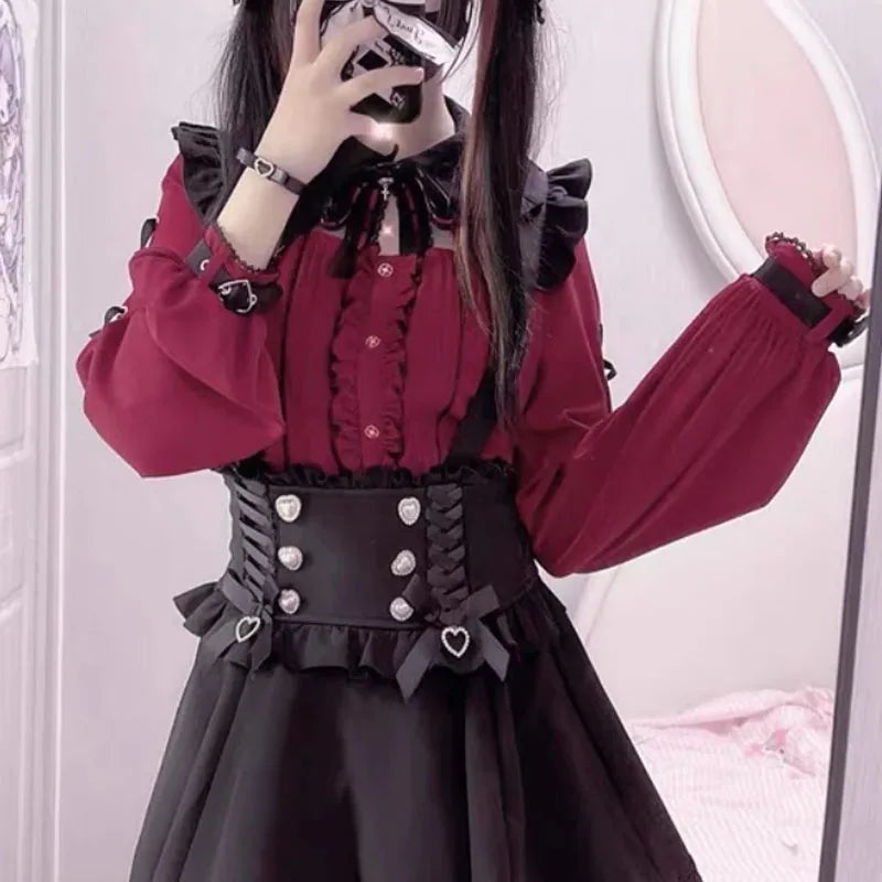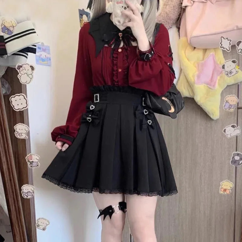 Gothic Lolita Shirt Women Harajuku Bat Lace Collar Black Red Long Short Sleeve Blouse Y2k Aesthetic Elegant Sweet Clothes Tops