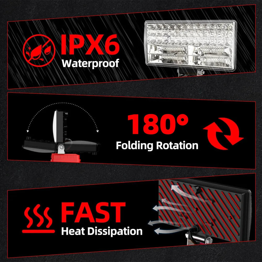 【Dual USB Charging Ports】This work light doubles as a charging station for your devices, including cell phones, Bluetooth headsets, and smartwatches. It includes a built-in low-voltage protection board, automatically shutting off when voltage drops below 15v to safeguard your work light.